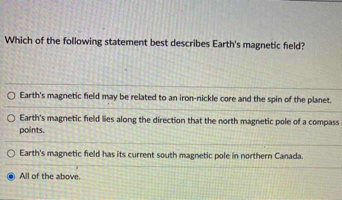 Which best describes Earths north magnetic pole. A Earths magnetic field may be related to an iron-nickel core and the spin of the planet. The force that pushes two magnets away from each other.